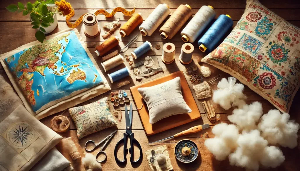 Eine Nähmaschine erleichtert dir das Nähen der Landkarten auf den Stoff erheblich, besonders wenn du viele Kissen herstellen möchtest. Alternativ kannst du auch eine Handnadel verwenden, um die Karten per Hand anzunähen. Das kann besonders bei kleinen, filigranen Arbeiten von Vorteil sein.