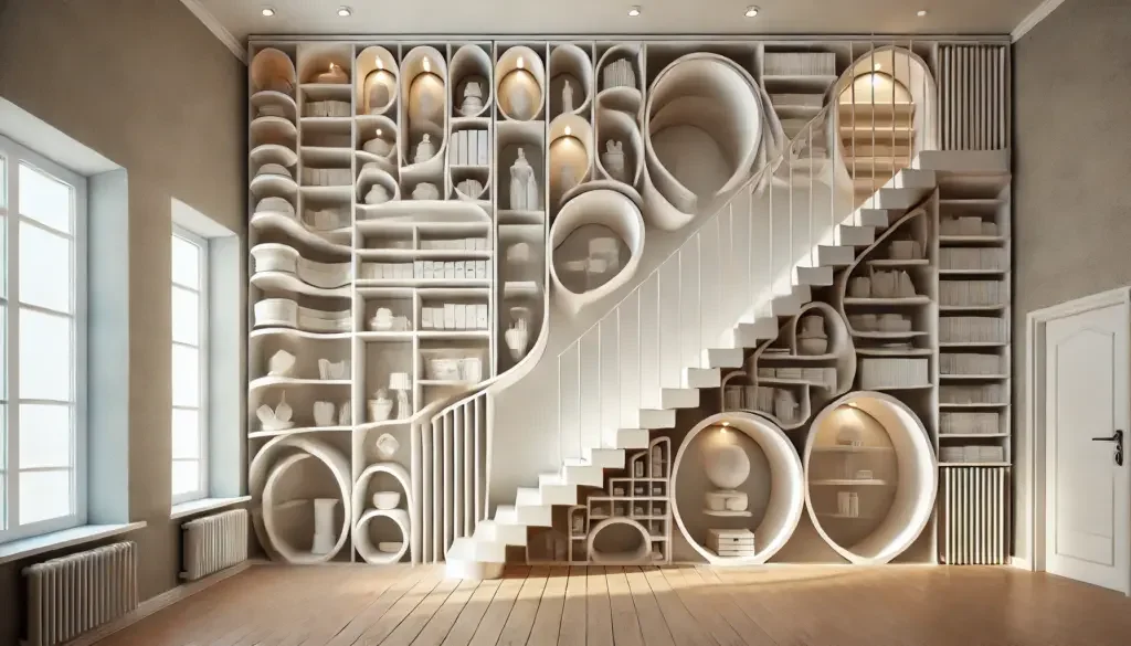 Ein Treppenregal ist auch ein willkommener Ordnungshüter, indem man den begrenzten Platz unter der Treppe oder einer Dachschräge optimal nutzen kann. So können ungenutzte Problemzonen schnell und problemlos zu echten Deko- und Stauraumwundern werden.
